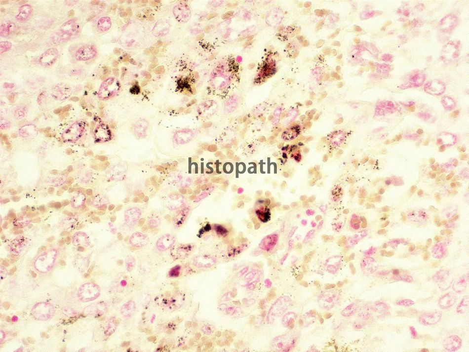 染色结果:铜为墨绿色,细胞核呈淡红色。