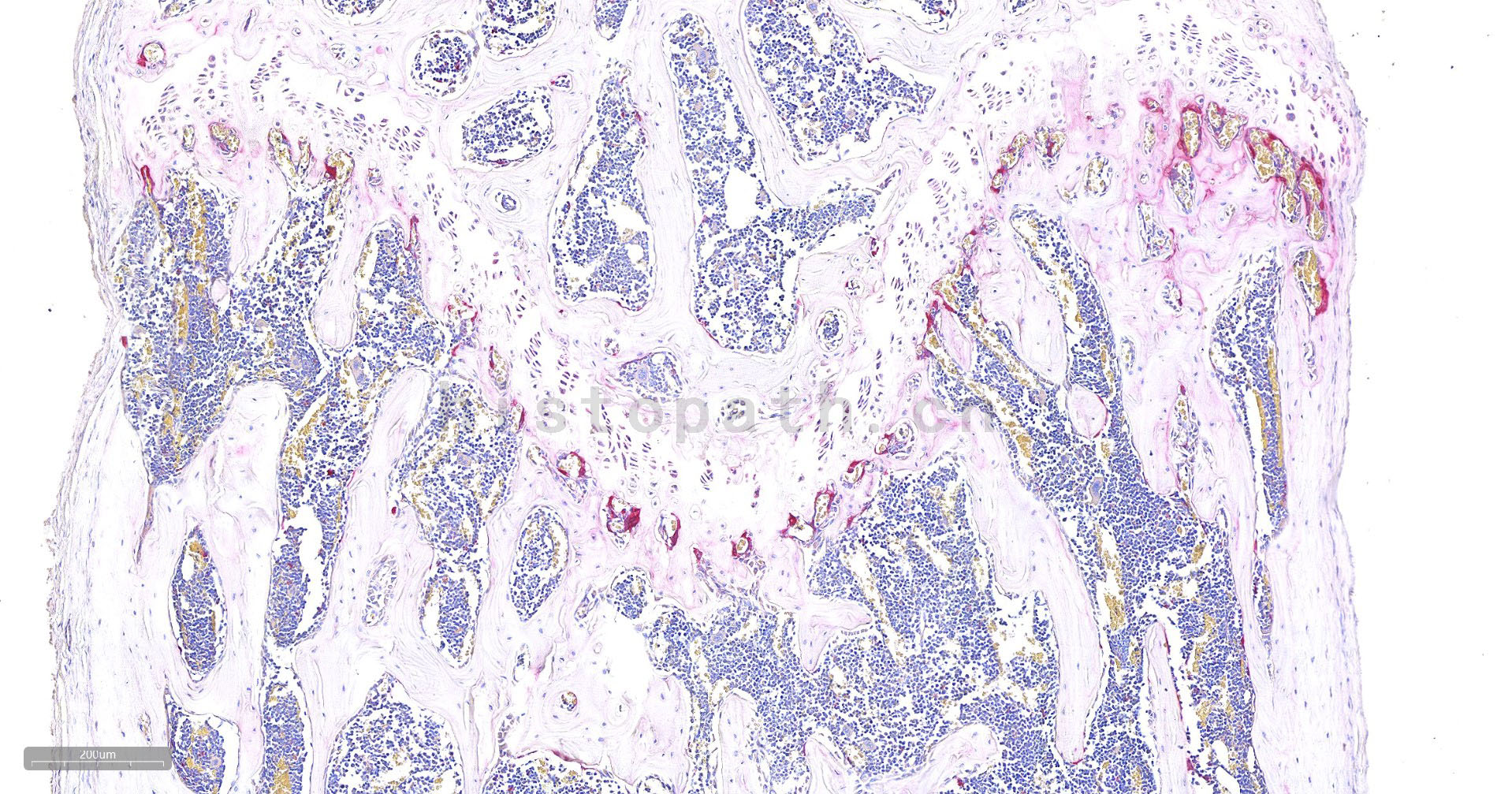 染色结果:破骨细胞呈红色,背景呈绿色或蓝色。