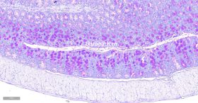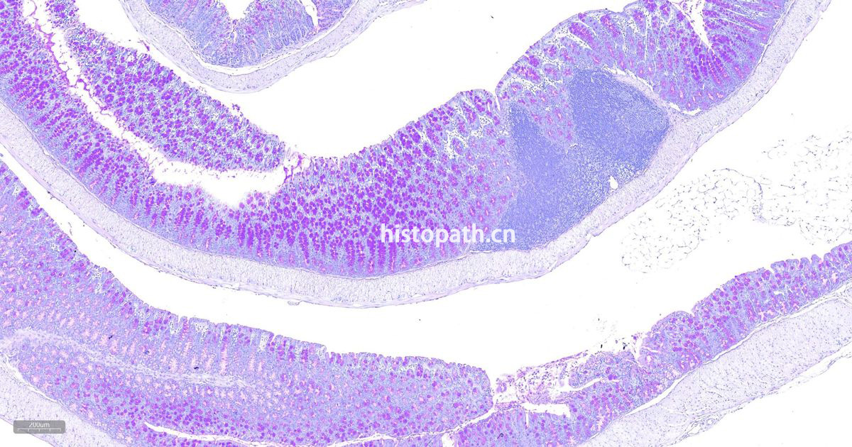 糖原是由D-葡萄糖的分支或直链组成的高分子多糖类化合物,糖原的合成与分解代谢主要发生在肝、肾和肌肉组织中。过碘酸是一种强氧化剂,能将组织或者细胞中的糖原及有关物质中的1,2-乙二醇基(CHOH-CHOH)氧化成两个游离醛基(- CHO),且过碘酸的特点是不再继续将醛基氧化成羧基。Schiff试剂(Schiff reagent),又称品红亚硫酸试剂,含碱性品红和亚硫酸,碱性品红与亚硫酸结合后,失去醌式结构而生成无色品红。无色品红与过碘酸氧化的游离醛基结合,醌式结构恢复,生成洋红色(magenta)产物,定位于胞浆,颜色没深浅与多糖含量成正比。