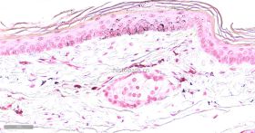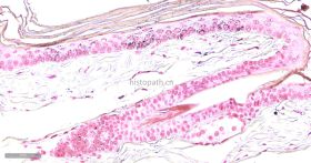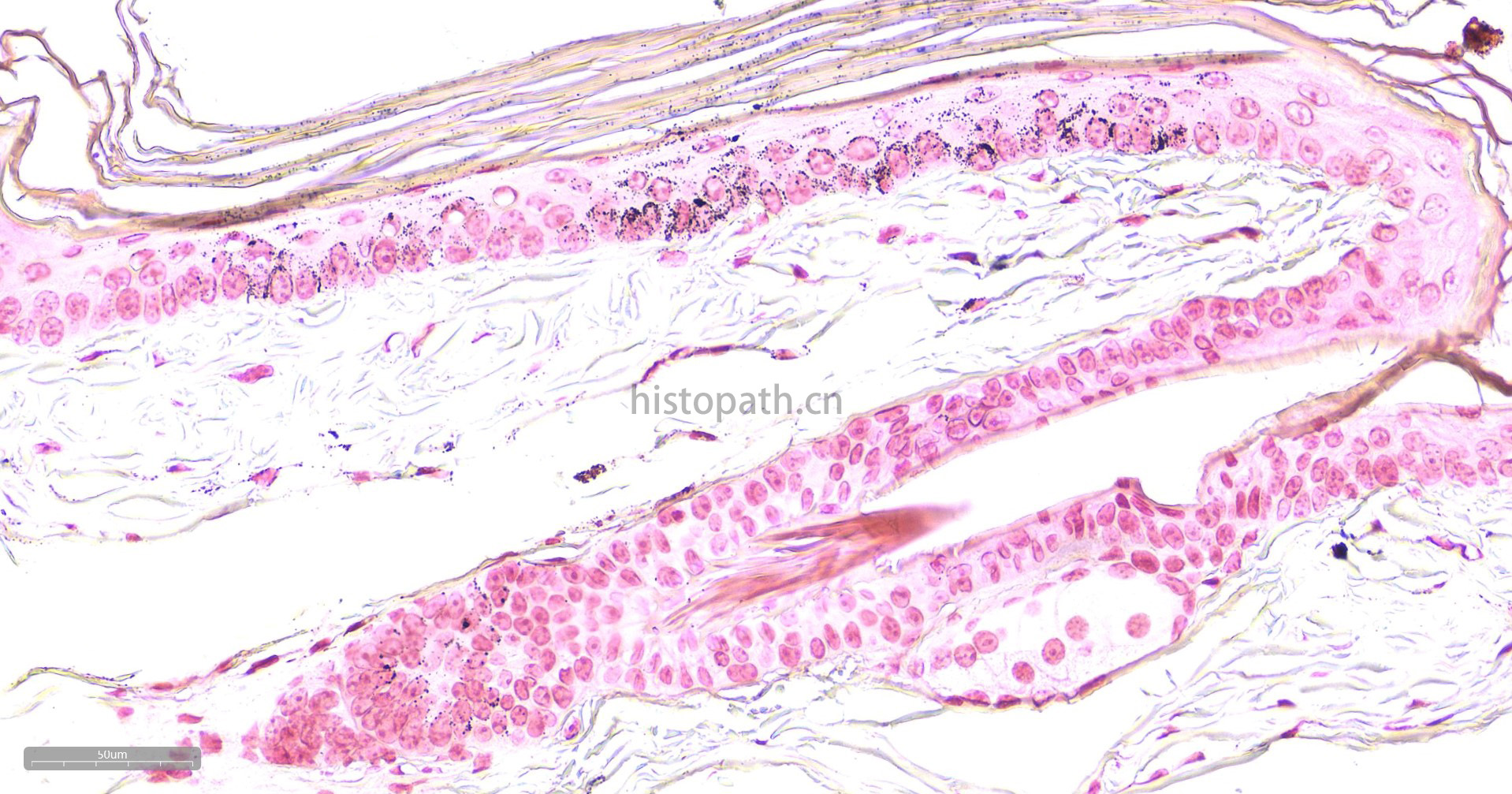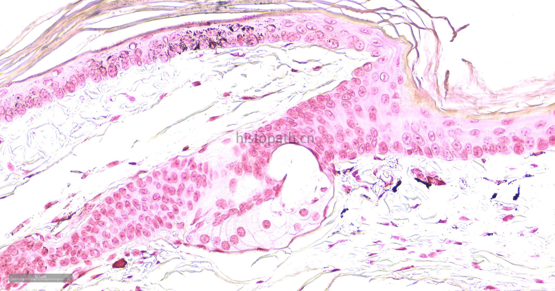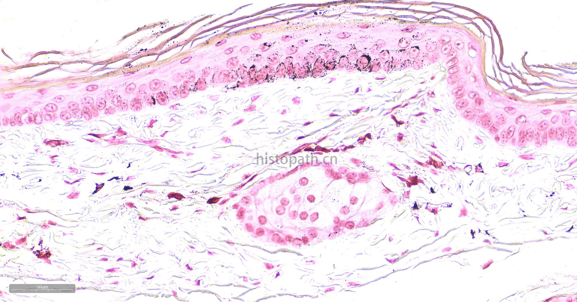 黑色素属于非血源性内生色素,是一组由黑色素母细胞产生的颜色从浅棕色到黑色的色素,这种色素通常出现在皮肤表皮、眼睛、大脑的黑质和毛囊中。黑色素有一个显著的物理性质,即完全不溶解于大多数有机溶剂--几乎可以肯定是由于黑素体中已形成的黑色素可与蛋白质紧密结合;黑色素另一个物理性质是能够被强氧化剂漂白,尽管这个过程是缓慢的,在病理情况下,这种色素也可出现在良性痣细胞瘤中和恶性黑色素瘤中,在常规HE染色中不呈黑色而是呈棕黄色或棕黑色,许多方法可用于识别黑色素和黑色素生成细胞,如还原方法,如Masson-Fontana银技术和Schmorl三价铁-铁氰化钾还原实验;酶方法(如多巴反应);荧光方法:免疫组织化学。