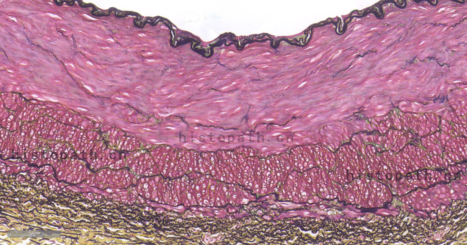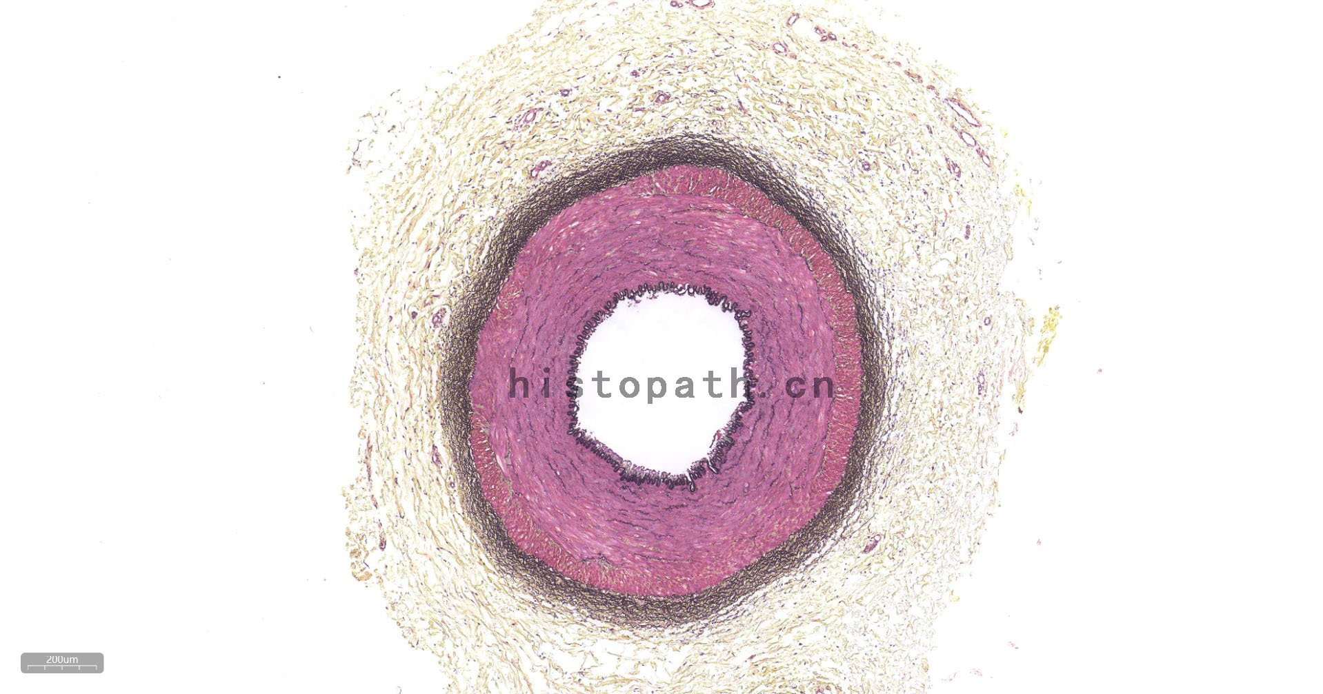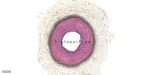 结缔组织狭义上是指其含有的三种纤维:胶原纤维、网状纤维、弹力纤维。结缔组织染色方法亦有很多种,如Masson三色染色法、Van Gieson染色法、Gomori氨银法、Mallory磷钨酸苏木素染色,然而以上染色方法只是侧重于某一两种组织的染色。Russell改良Movat五色套染以其染色丰富、呈色鲜艳而大受欢迎。该染色法常用于显示动脉粥样硬化斑块。苏木素用于染细胞核和弹力纤维,品红用于染细胞质和肌肉纤维,藏红花染胶原组织,阿利新蓝染基质(蛋白聚糖)。